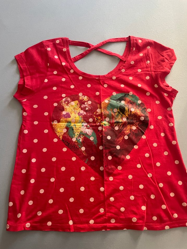 Kırmızı kısa kollu, V yakalı, düğmeli ve beyaz puantiyeli kız çocuk tişörtü. Önünde renkli kalp baskısı ve bohem tarzı detaylar bulunur.