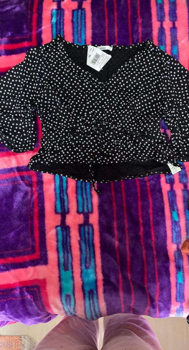 Kadınlar için yarım kol, V yaka ve düğmeli ön kısmı olan, sentetik kumaştan yapılmış, koyu renkli puantiyeli kısa ve mini boyda dar kesim bluz.