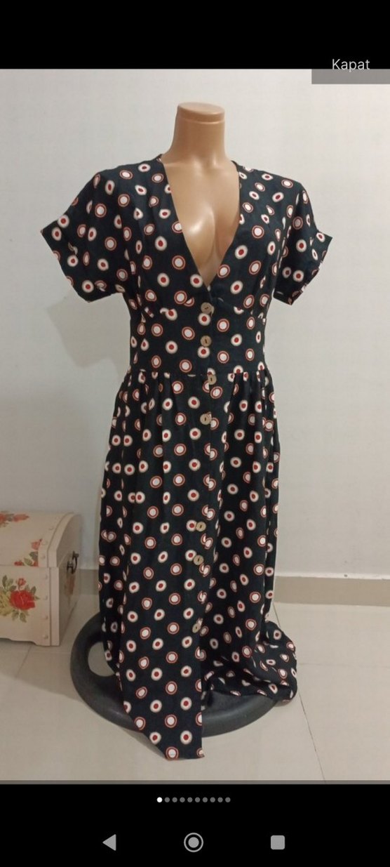 Düğmeli, V yakalı, kısa kollu ve fit kesim olan bu uzun elbise, koyu renkli çok renkli puantiye desenine sahip. viskon kumaştan, günlük kullanıma uygun bohem tarzda. 40 yazsa da en 46 boy 112 cm. kusursuzdur iki defa içine ip askılı bluz ile giydim tertemiz yepyeni beden değişimi nedeniyle satışta