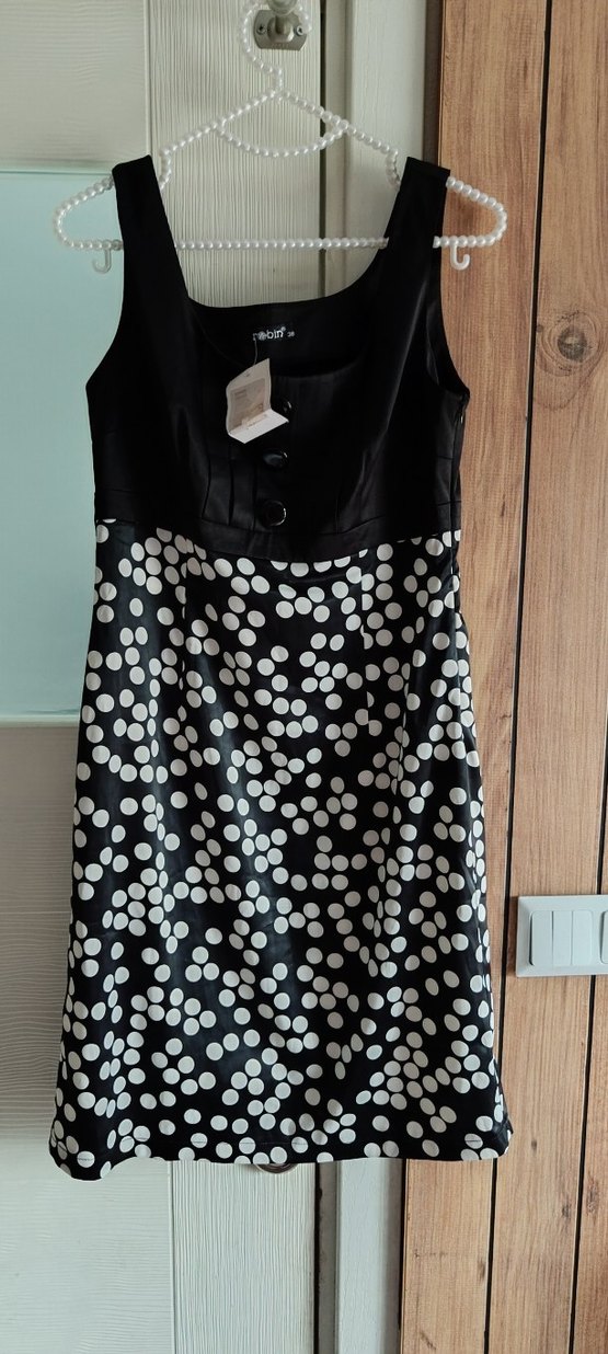 Düğmeli üst kısmı ve siyah beyaz puantiyeli deseniyle, v yaka ve kolsuz, ofis için uygun elbisesi. 38 ve 40 beden uyumlu sıfır etiketli
