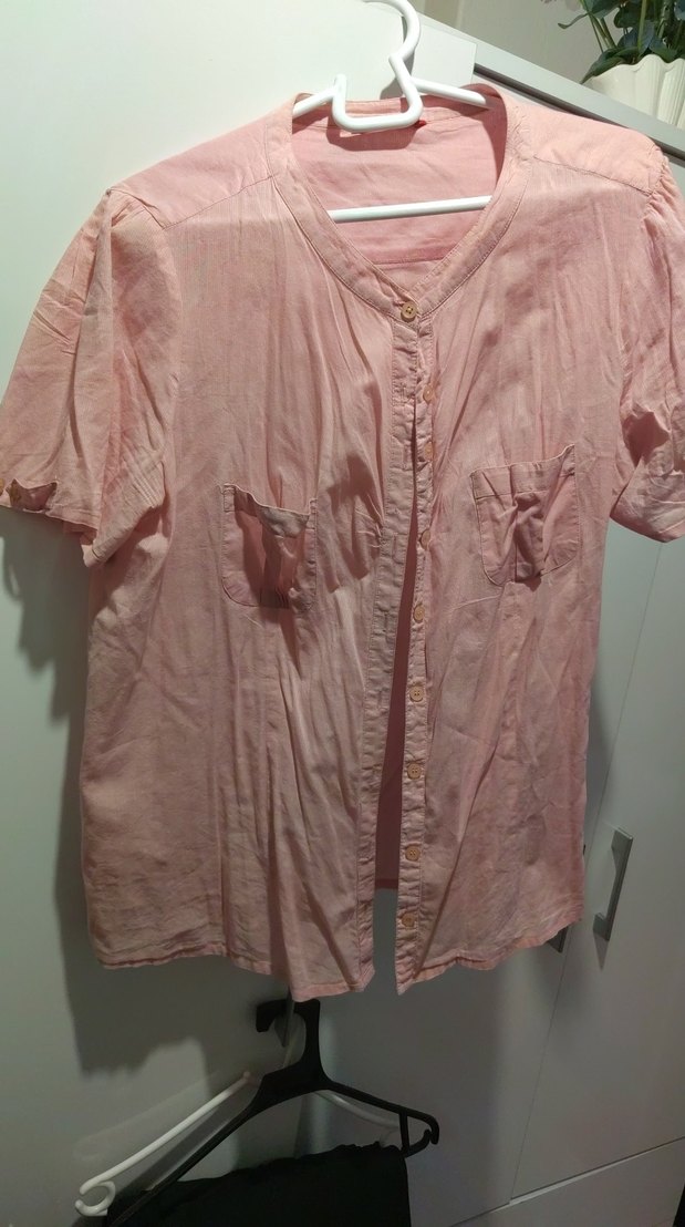 Düğmeli, kısa kollu, keten kumaştan yapılmış, pastel pembe renkte bol kesim gömlek. Vintage tarzını yansıtan iki ön cepli ve yakası çentikli.