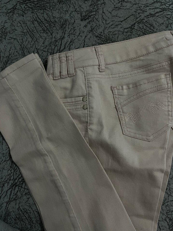 Düğmeli ve normal boyda, fitted kesim kadın denim pantolon. Günlük rahat kullanıma uygun, desensiz sade tasarım. Rengi burda belli olmamış ama pudra renginde. 90’s vibe. Pazarlık payı vardıırr
