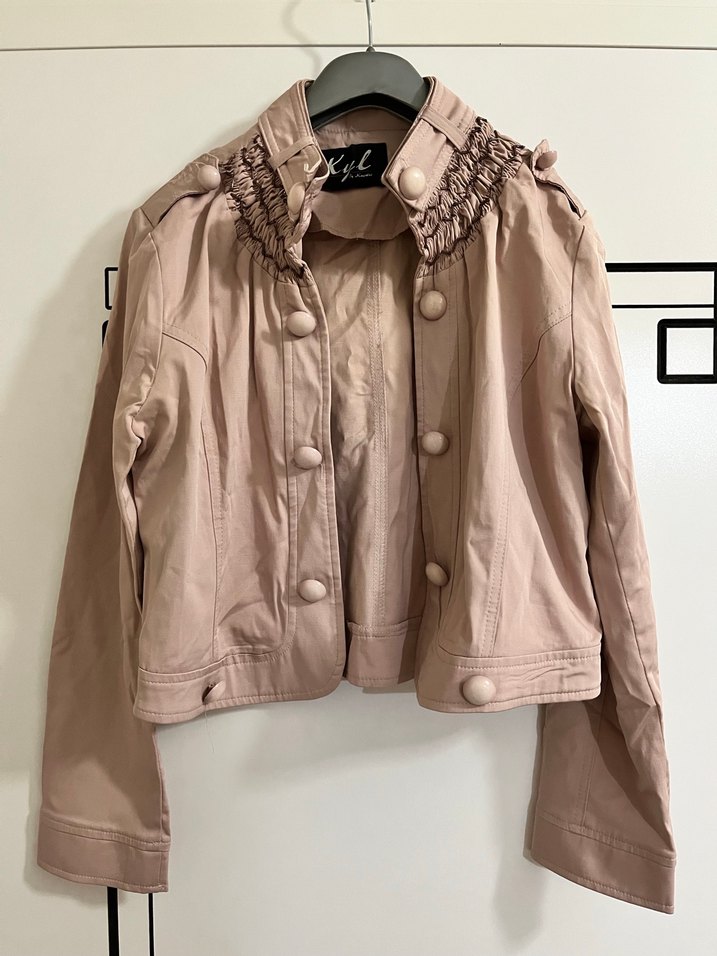 Düğmeli, işlemeli detaylara sahip, pudra rengi, uzun kollu, normal boyda ve notched yaka kadın ceket.