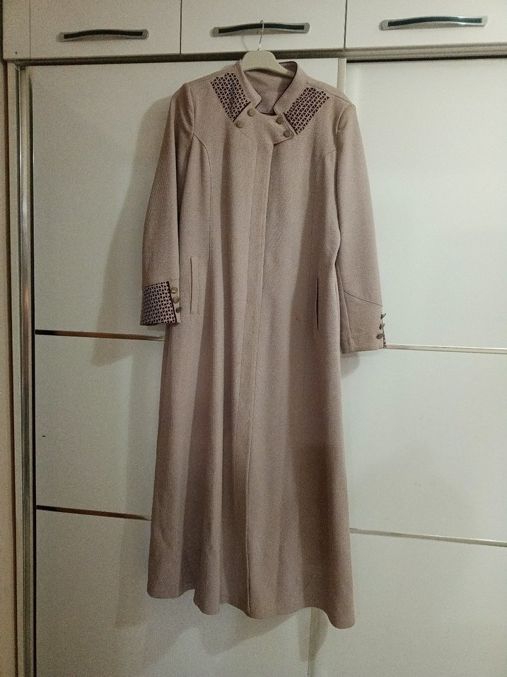 Düğmeli pudra renkli uzun pardesü mevsimlik