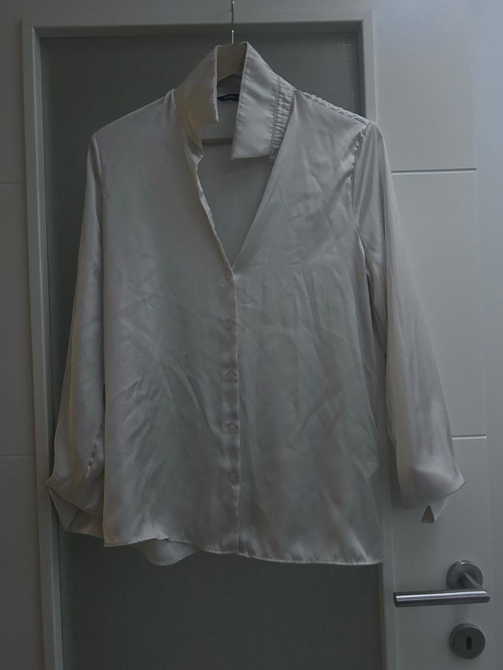 Düğmeli, yakalı pudra renk saten gömlek, uzun kollu ve rahat kesimdir. Ofis ve günlük sokak stiline uygundur.