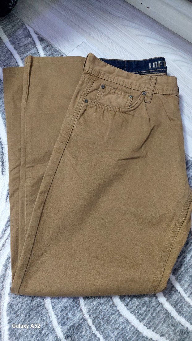 Yumuşak keten kumaştan, parlak görünümlü Camel rengi, düğmeli ve rahat kesim erkek pantolonu. Günlük kullanıma uygundur. Bel 87 cm boy 96 cm Paça genişliği 19 cm