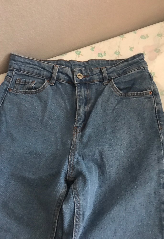 Düğmeli, rahat kesim, midi boy kadın jean pantolon. Mavi ve hafif gri tonlu, gündelik sokak stili için uygun. Hafif bir iz vardır fotoğrafta mevcut