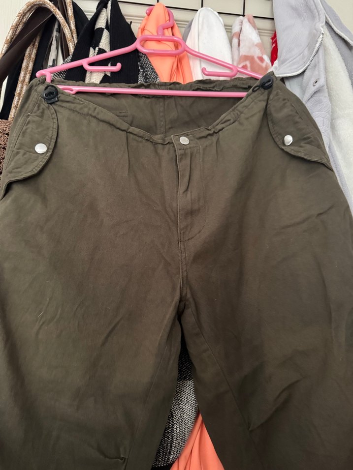 Düğmeli detaylara sahip, rahat kesim kahverengi keten kadın pantolon. Midi boy, günlük rahat ve sokak tarzına uygun.