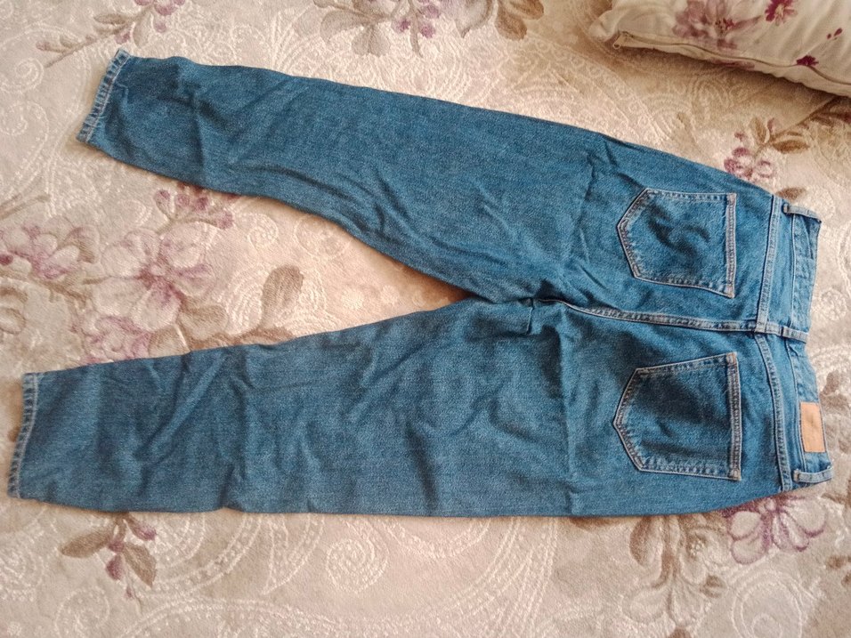 Düğmeli, rahat kesim midi boy kadın kot pantolon. Mavi renkte, günlük kullanım için uygun rahat tarzda kot pantolon.rahat hafif .boydan 94 cm. bel 36 cm.