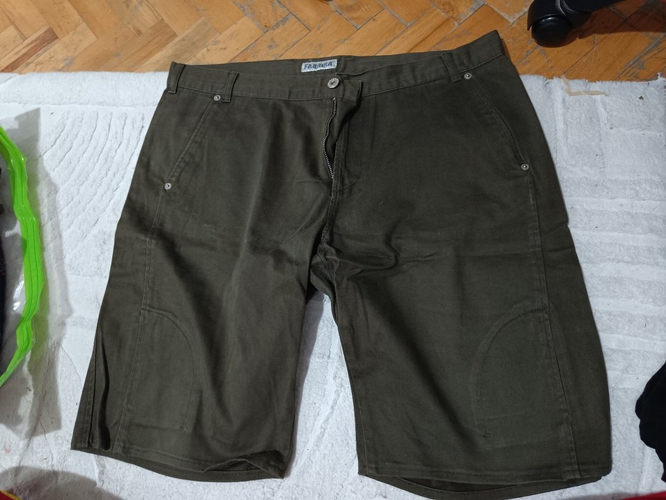 Düğmeli kapama ve yan ceplerle rahat kesim, keten kumaştan yapılmış kahverengi-gri tonlarında erkek şort. Günlük kullanıma uygundur.