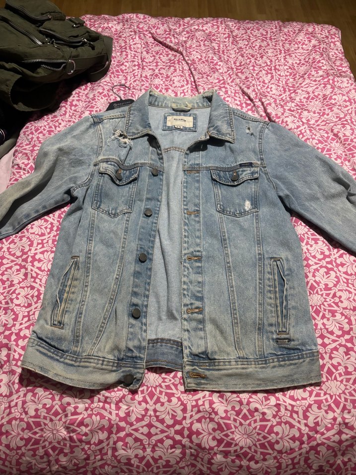 Düğmeli, rahat kesim ve notalı yaka detaylı uzun kollu mavi kot erkek ceket, günlük kullanıma uygundur.