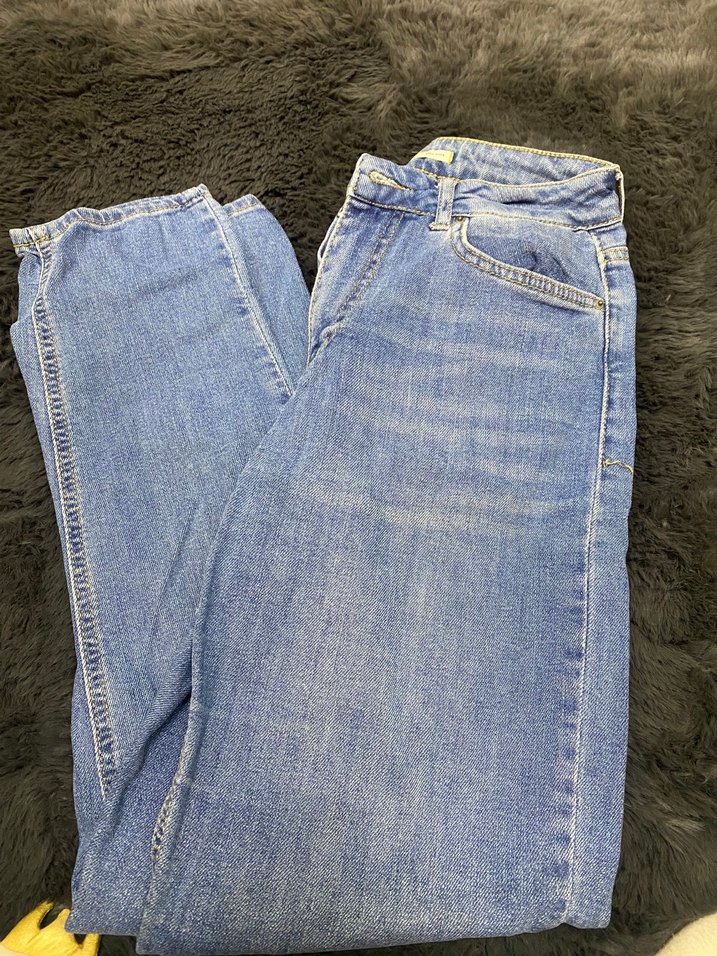 Düğmeli, rahat kesim, midi boy mavi kot pantolon. Desensiz ve günlük kullanıma uygun, sokak stili esintili.