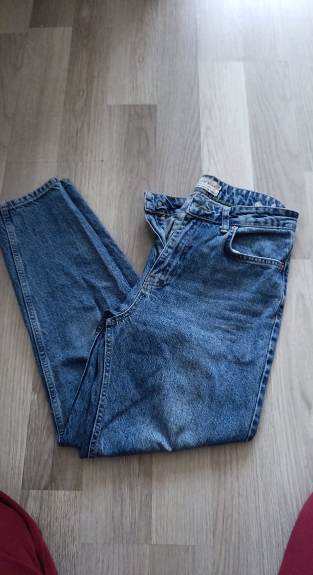 Düğmeli, rahat kesim yüksek bel mavi kot pantolon. Orta boy, desensiz ve günlük sokak stili için uygun.