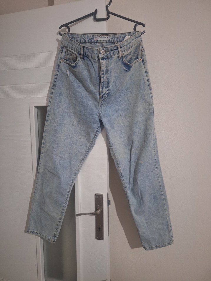 Düğmeli, rahat kesim midi boy kot pantolon, günlük kullanım için uygun, mavi renkte ve desensiz.