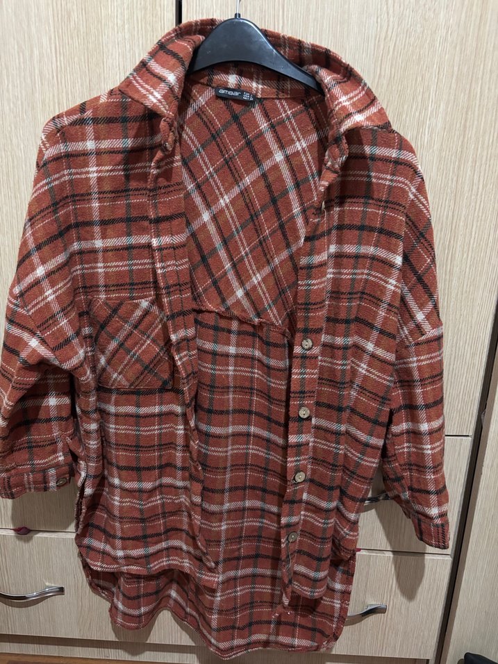 Kadın gömlek, düğmeli, rahat kesim, uzun kollu ve yakalıdır. Yumuşak sentetik kumaştan, koyu kahverengi kareli desene sahip, günlük sokak stiline uygundur.