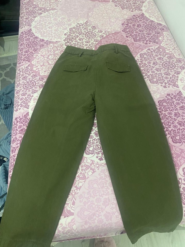 Pamuklu kumaştan yapılmış, düğmeli detaylı koyu yeşil, rahat kesim kadın pantolonu. Midi boy, günlük kullanıma uygun rahat stil.
