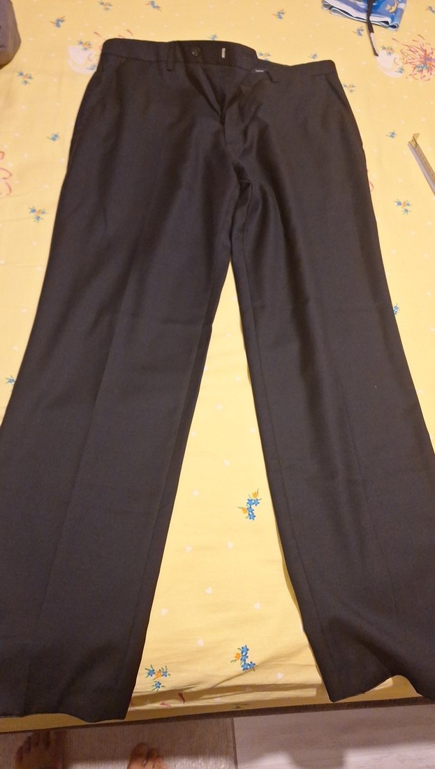 Düğmeli, regular fit erkek pantolon. İpek gibi kumaştan, sade ve iş stilinde, ofis için uygun koyu bej renkte.