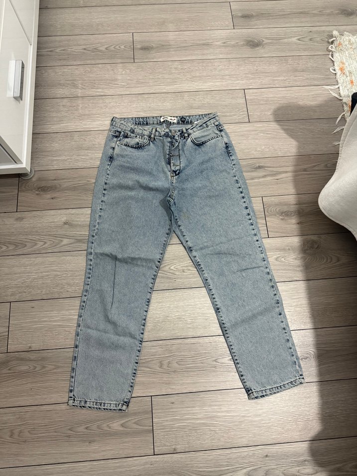 Düğmeli, regular fit kesime sahip kadın mavi denim jean. Günlük kullanıma uygun midi boyda, rahat ve şık bir sokak stili parçası. kücük bi lekesi var yikayinca gecebilir