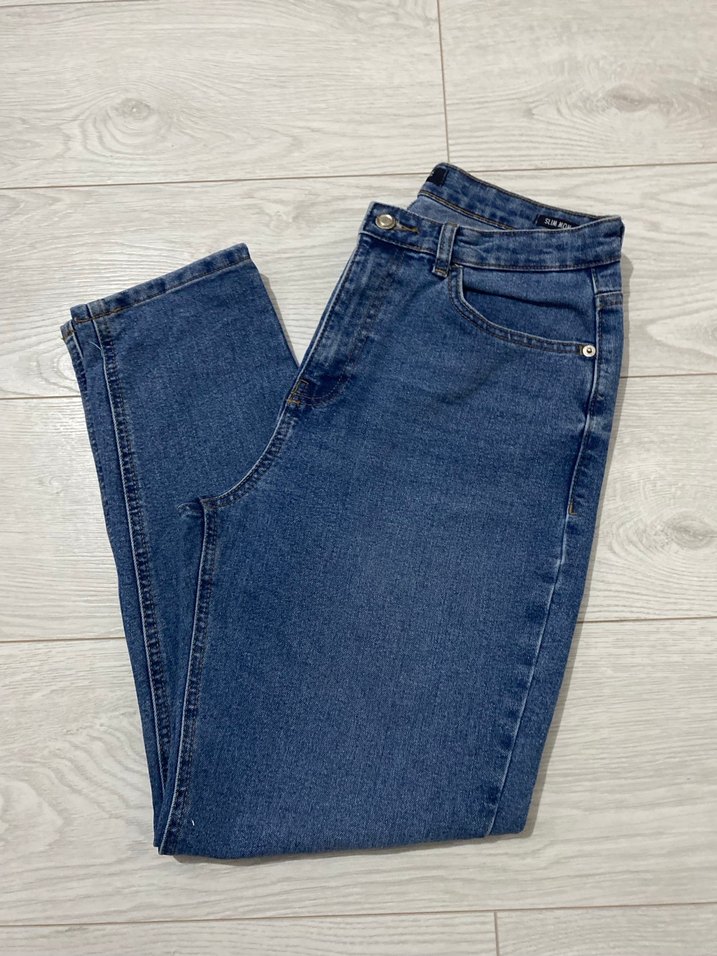 Düğmeli kapamalı, regular fit mavi denim kadın jean. Günlük kullanıma uygun, midi boy ve desensiz sade tasarım. Sadece 2-3 kere giyildi tertemiz bana bol geldiği için ve artık tarzım olmadığı için satıyorum