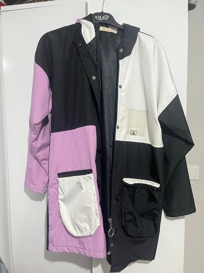 Gevşek kesim, düğmeli, uzun kollu ve notlu yakalı bu midi yağmurluk, sentetik kumaştan yapılmıştır. Mor, siyah ve beyaz renk bloklu deseni ve büyük cepleriyle günlük kullanım için uygundur. Fotoğraflarda göründüğü gibidir bi düğmesi kopmuştur bilginize