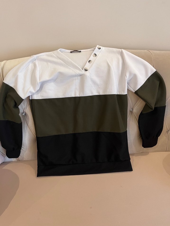 Akrilik düğmeli yaka ve uzun kollu, renk bloklu bol kesim sweatshirt.