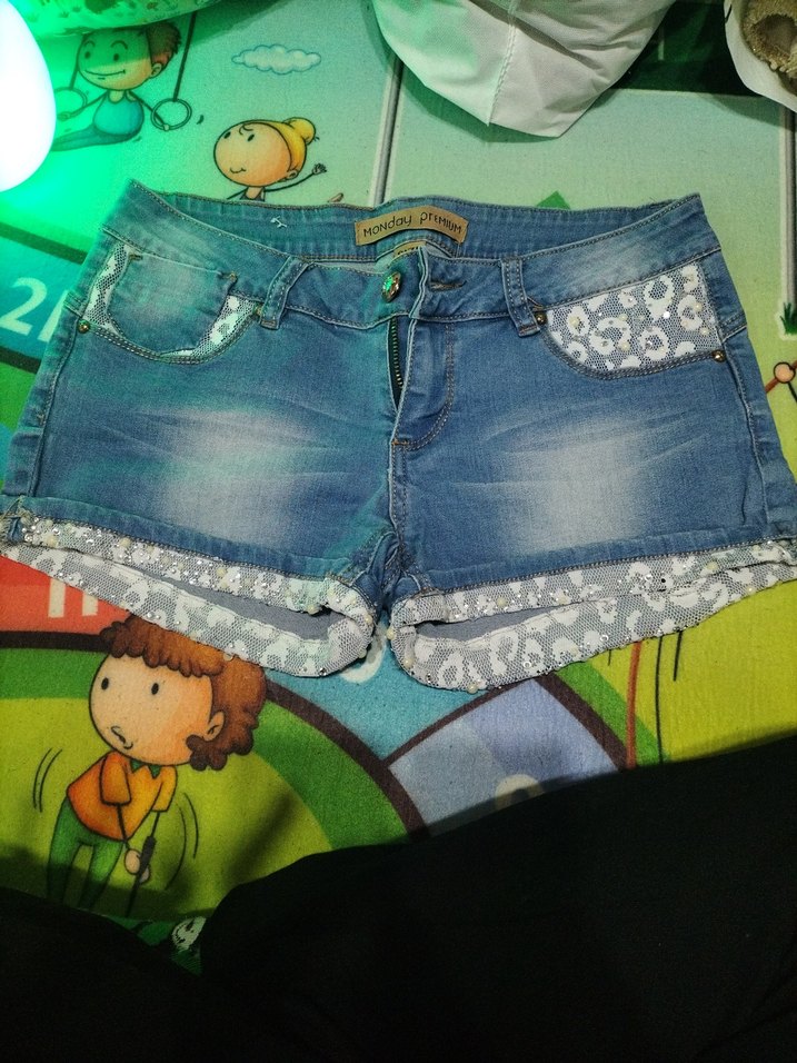 Renkli batik desenli, düğmeli, bol kesim mini kot şort. Günlük sokak stili ve partiler için uygundur.
