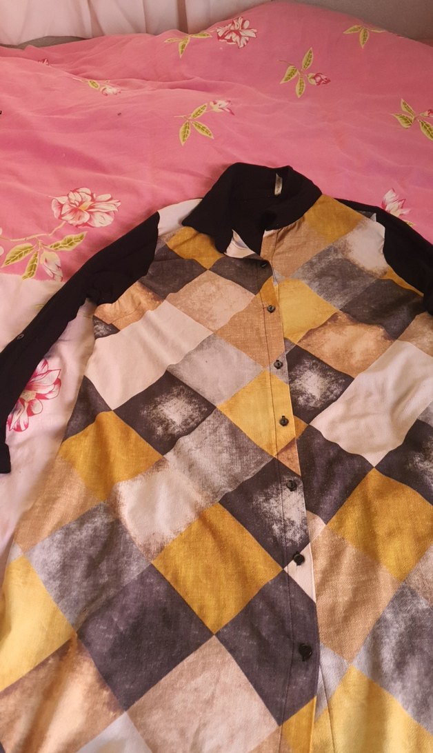 Düğmeli, uzun kollu, salaş kesim kadın gömlek. Çok renkli desenli, midi boyda, sentetik kumaştan, sokak modası ve grunge punk tarzını yansıtır.