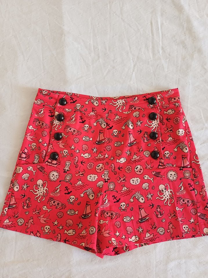 Renkli desenli ve düğmeli, vücuda oturan mini şort, vintage parti tarzı için uygun. Çinden hediye geldi hiç kullanılmadı. %97 cotton %3elastan mercan renkte çok tatlı bir şort.