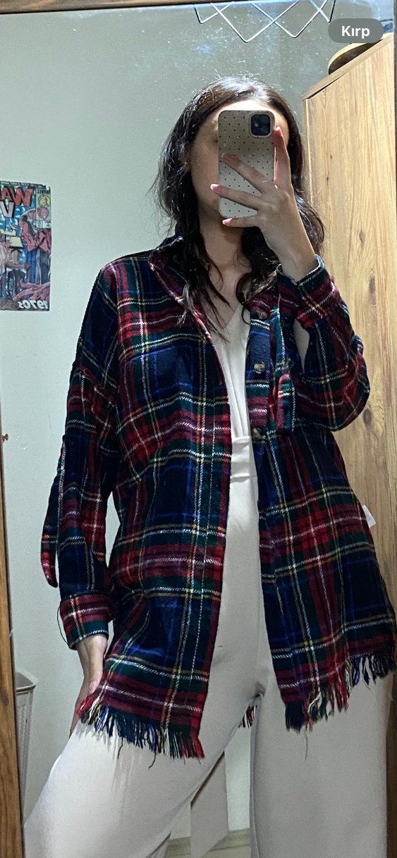 Bu bol kesim kadın gömlek, uzun kollu ve yakalı olup düğmeli ön kısmı ve çok renkli koyu ekose deseni ile dikkat çeker. Yumuşak ve sıcak bir kumaştan yapılmıştır, günlük kullanım için uygundur.