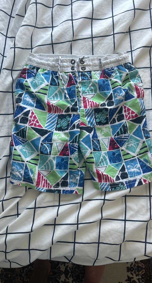 Renkli batik desenli, düğmeli ön kısmı olan bol kesim erkek mini şort, plaj ve günlük sokak giyimine uygun.