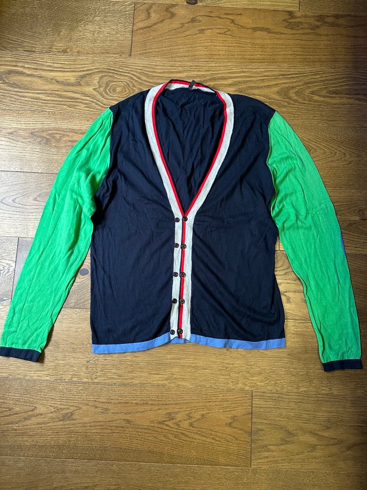 Benetton erkek hırka, uzun kollu ve düğmeli ön yapıya sahiptir. Salaş kesim, bisiklet yaka ve midi boydadır. Yeşil kollar ve lacivert gövde ile canlı renkler kullanılmıştır. Günlük rahat kullanım için uygundur.