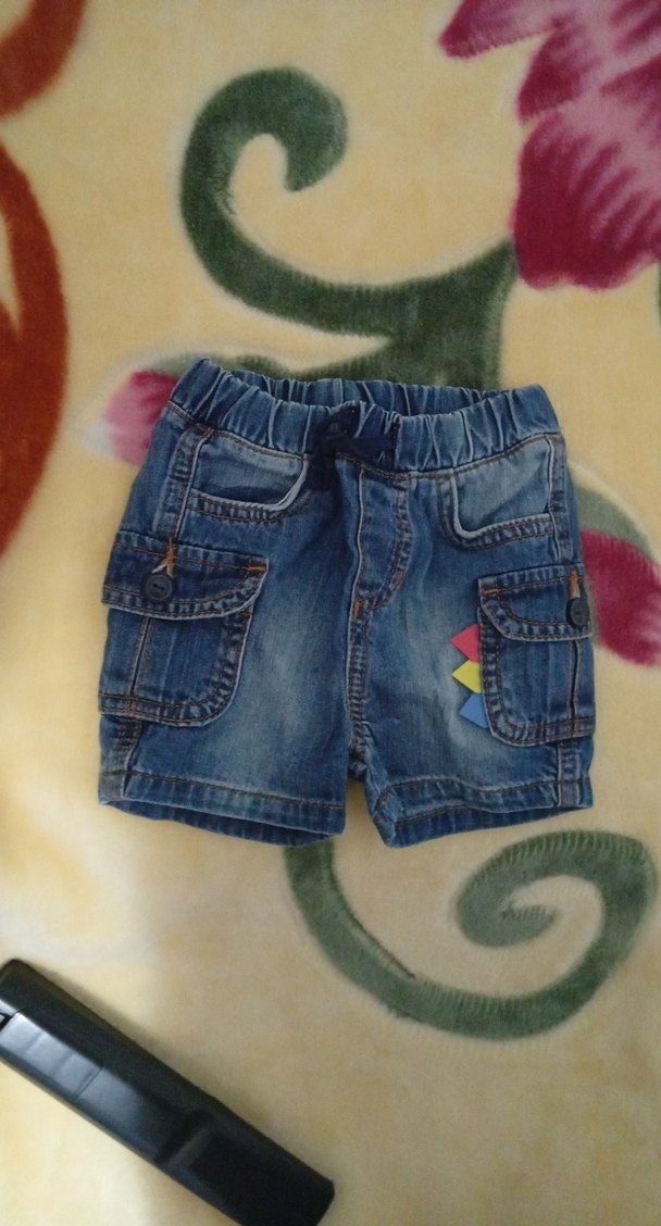 Mavi renkli, düğmeli cepli, bol kesim erkek kot şort, elastik bel ve renkli batik detaylarla tamamlanmıştır.