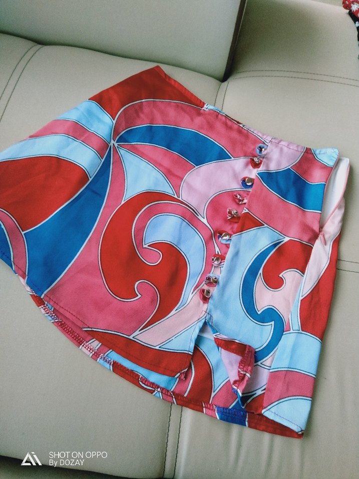 Renkli tie-dye desenli, düğmeli ve ince dokulu bol kesim yırtmaçlı mini etek. parti için uygun.