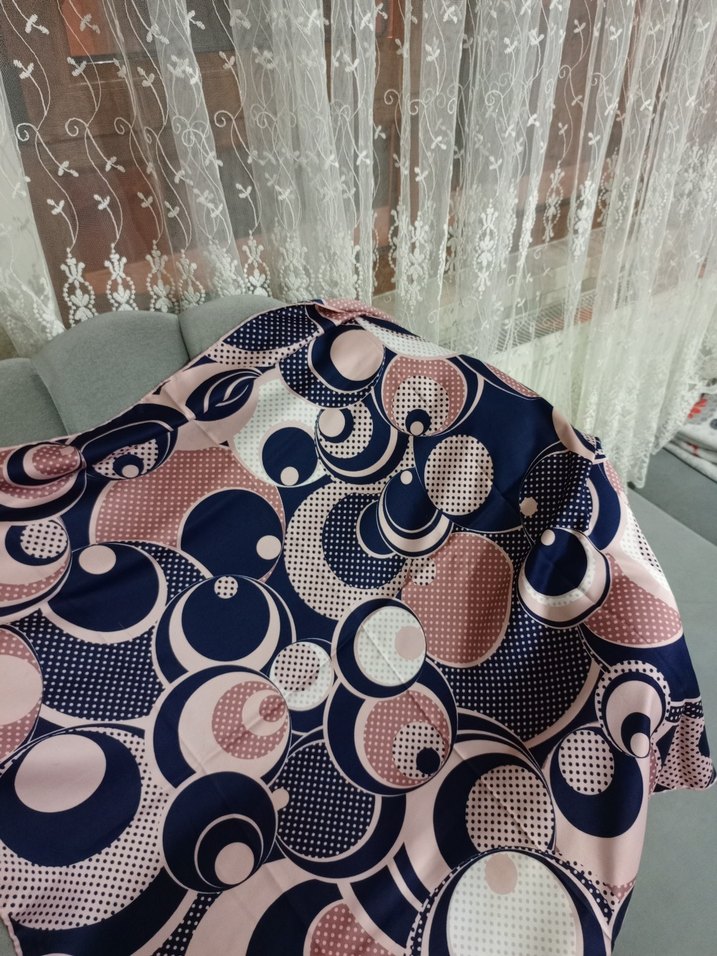 Yumuşak sentetik kumaştan, düğmeli, pastel çok renkli retro desenlere sahip çağdaş kadın fuları. Bohem ve hippie tarzlar için uygundur.