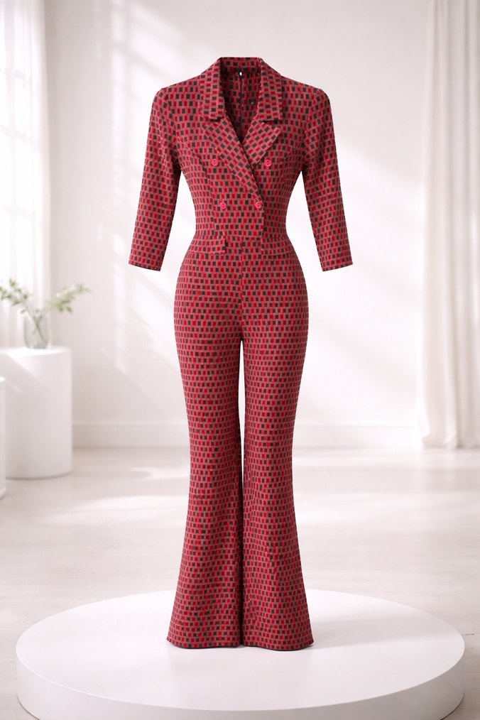 S/M/L bedenleri mevcut Düğmeli, üç çeyrek kollu, retro tarzda kırmızı puantiyeli kadın tulum. Regular fit, sentetik kumaş, ofis için uygun, yakası kesik ve renkli desenli.