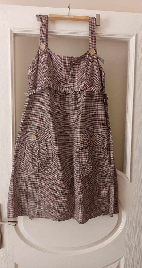 Düğmeli ve cepli, salaş kesim, kolsuz hamile midi elbise. Yumuşak dokulu kahverengi kareli kumaştan, günlük kullanıma uygun.
