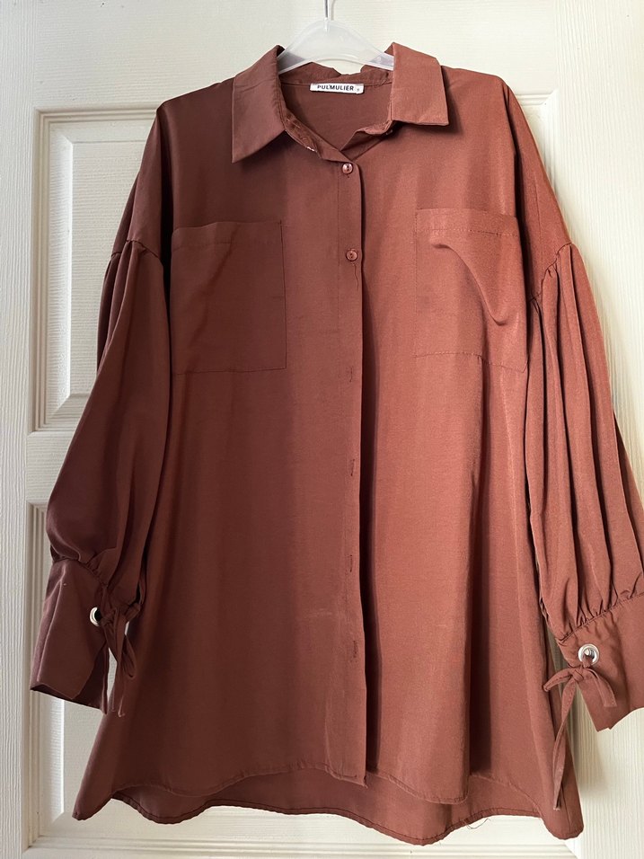 Düğmeli, yakalı ve uzun kollu bej renkli, salaş kesim kadın gömlek. İpeksi kumaştan, parlak görünümlü, günlük kullanıma uygun. ✨
