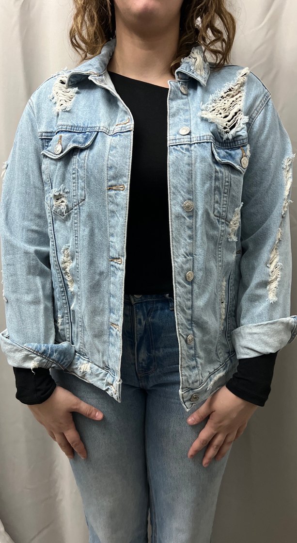 Salaş kesim, düğmeli kadın denim ceket, yaka detaylı ve uzun kolludur. Açık mavi ve gri tonlarında, günlük kullanıma uygun yırtık detaylı casual stil ceket.