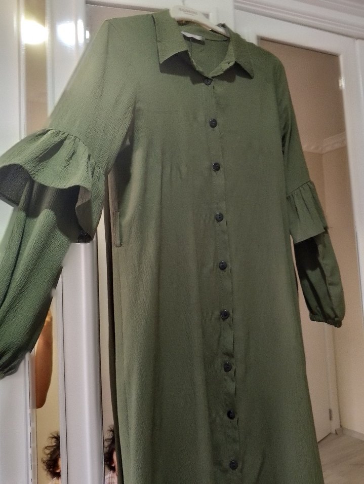Düğmeli ön kısmı, volanlı uzun kolları ve kesik yaka detayı olan, salaş kesim ve parlak görünümlü haki uzun elbise. Günlük rahat gömlek elbise
