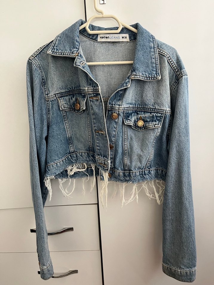 Mavi kot ceket, düğmeli, salaş kesim, uzun kollu ve çentikli yaka detayına sahiptir. Alt kısmı yırtık görünümlü, günlük kullanıma uygun.