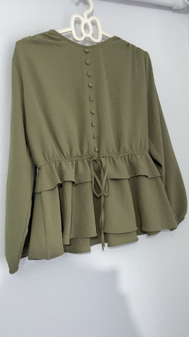 Haki renkli, uzun kollu, düğmeli ve salaş kesim midi uzunlukta kadın bluz. Bel kısmında bağcık ve pile detayları bulunur. Günlük rahat sokak stili için uygundur.