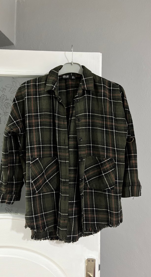 Düğmeli, salaş kesim kadın gömlek, uzun kollu ve yakası kesikli. Koyu haki ekose deseniyle günlük sokak stiline uygun midi uzunlukta, tekstil kumaştan yapılmıştır.