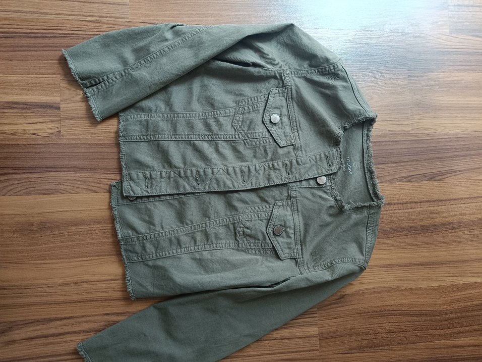 Salaş kesim, düğmeli, keten kumaştan yapılmış kadın ceketi. Uzun kollu, yakası kesik ve haki renkte, günlük rahat kullanım için uygun.