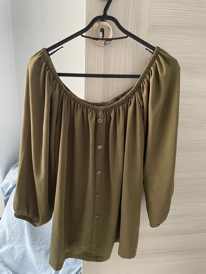 Parlak khaki keten kumaştan, salaş kesim, düğmeli, uzun kollu ve tek renkten oluşan midi boy kadın bluz. Trendy günlük kullanım için uygundur. Görüldüğü gibidir. L-XL uyumludur.marka temsili