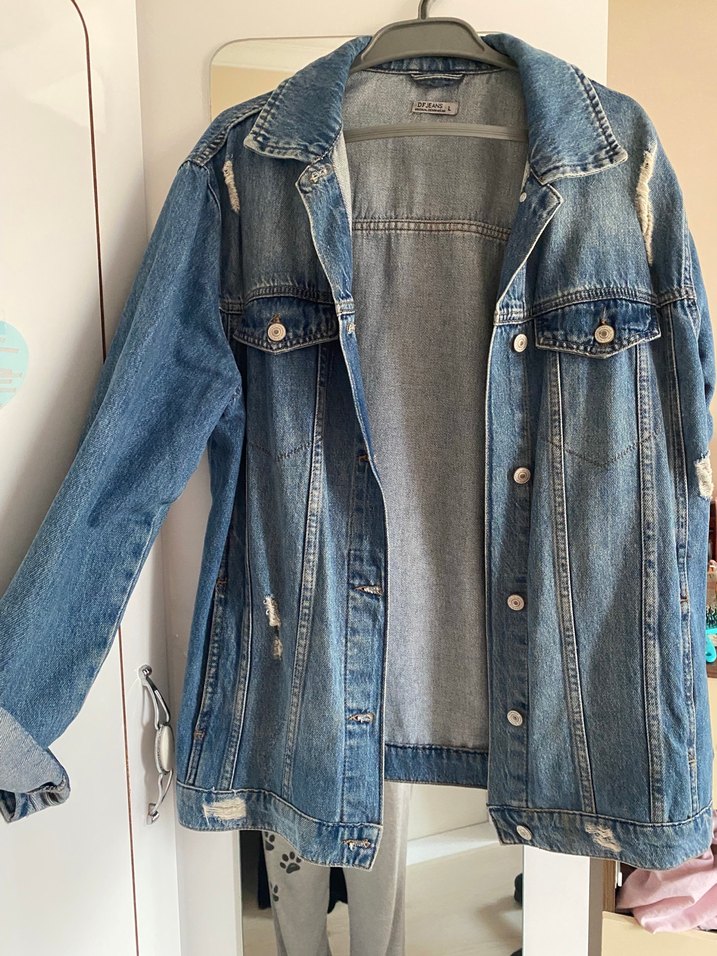 Düğmeli, notched lapel yakalı, salaş kesim mavi denim ceket. Normal midi uzunlukta ve hafif yıpranmış görünümlü, günlük sokak stili için uygun.