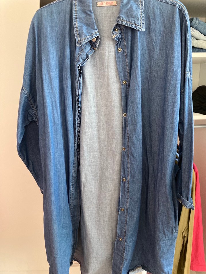 Uzun kollu, düğmeli, salaş kesim kadın kot ceket. Midi boy ve düz mavi renkte, rahat günlük ve sokak stiline uygun. ürün kullanıldı ancak hiç kusuru yok kumaşı ince normal kot gibi değil