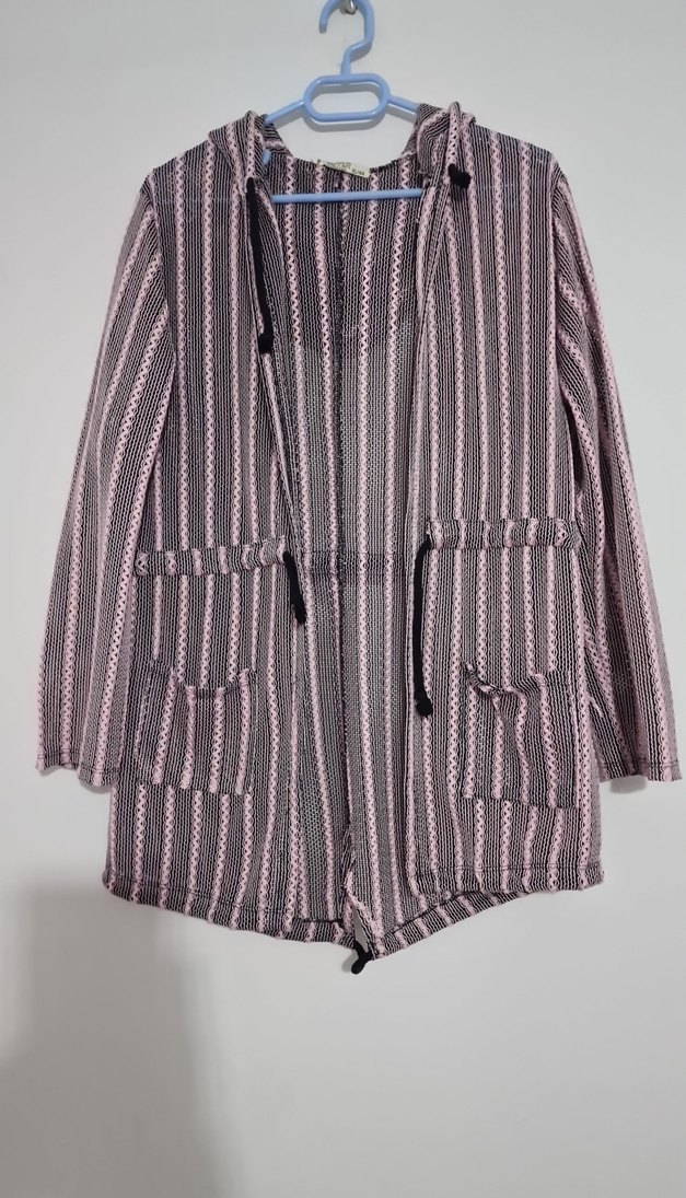 Kadın plaj giysisi uzun kollu ve salaş kesime sahip. Düğmeli, yakalı ve pembe-gri tie-dye desenlidir. Sentetik kumaştan midi boyda, rahat plaj tarzı için uygundur.