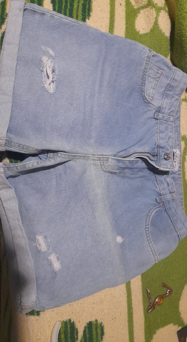 Salaş kesim, düğmeli mini kot şort, gri-mavi tonlarında, hafif yıpratma detaylı, rahat sokak stili. Açık hava kullanımı için uygun.