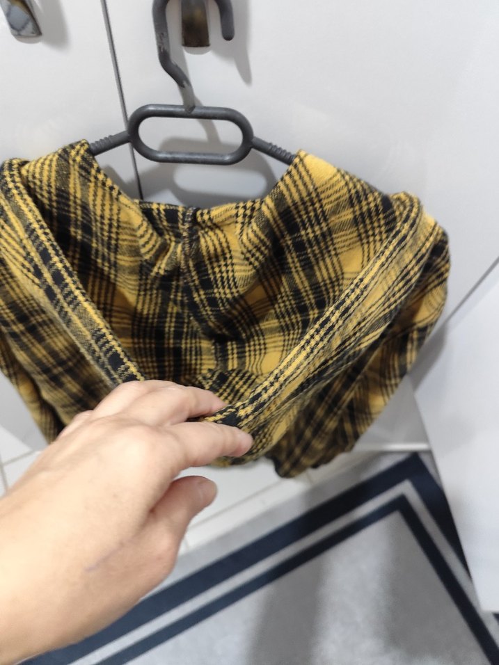 Düğmeli, bol kesim sarı ekose midi hamile eteği. Günlük sokak stili için uygun, parlak dokulu tekstil kumaş.