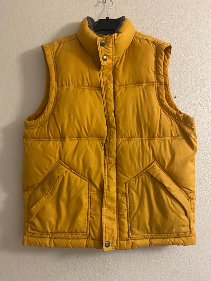 Düğmeli, yüksek yakalı, parlak sarı renkte, yumuşak ve sıcak kumaştan erkek yeleği. Sokak stiline uygun, kolsuz ve dar kesimdir. İki önde cep bulunur.